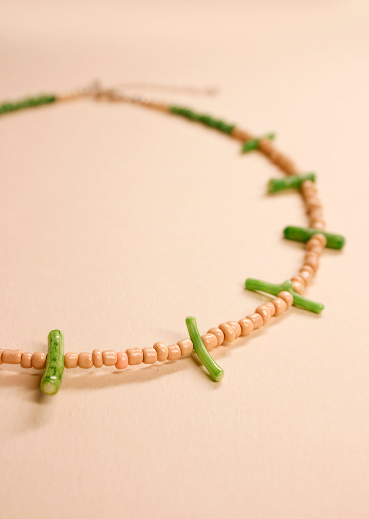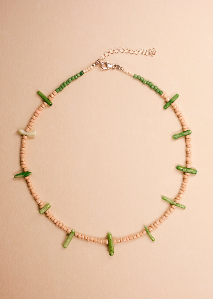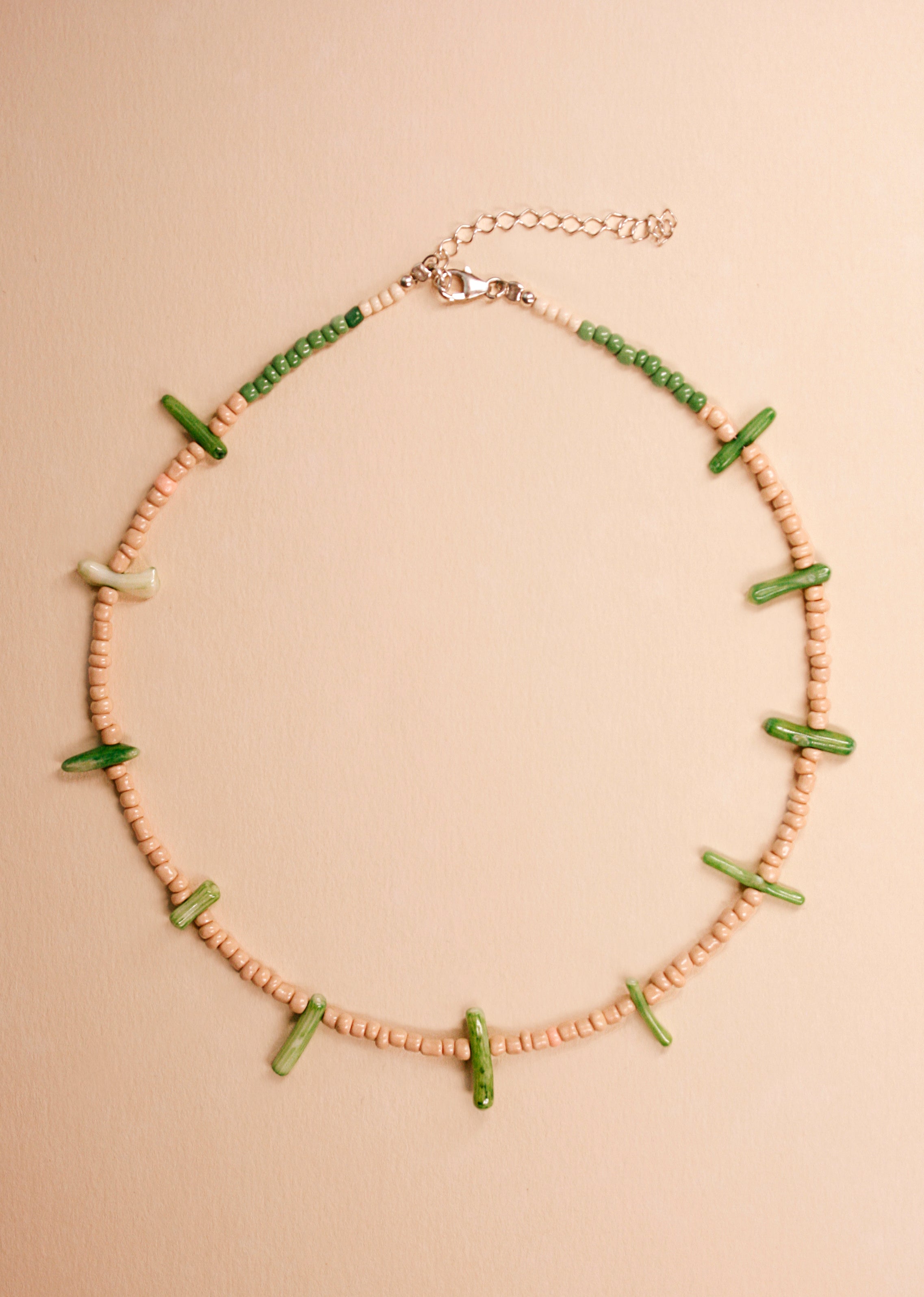Bloom Bliss evokes the joyful burst of spring blooms. This necklace, with its fresh green accents and playful leaf motifs, adds a touch of nature’s delight to any ensemble, perfect for those who cherish vibrant, uplifting accessories.