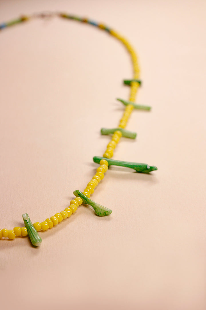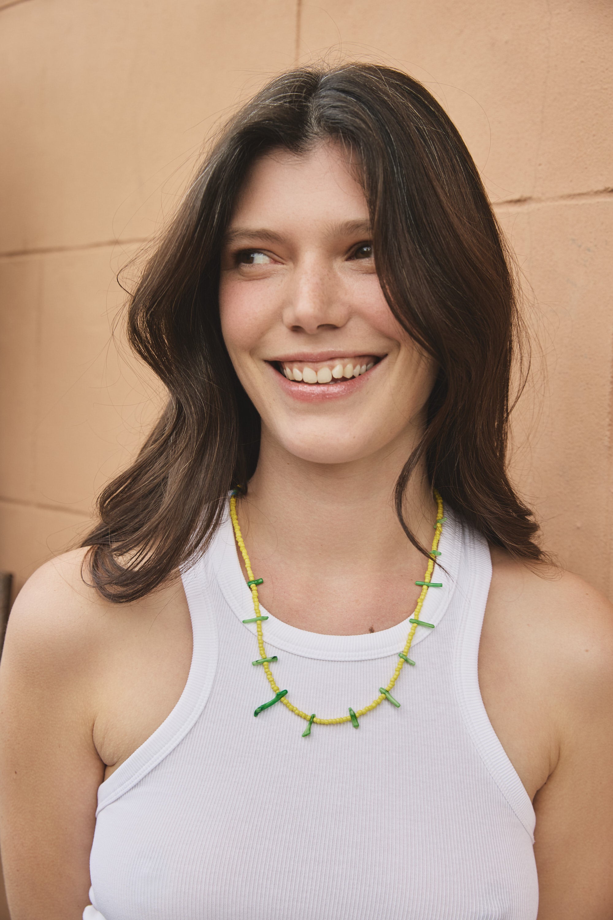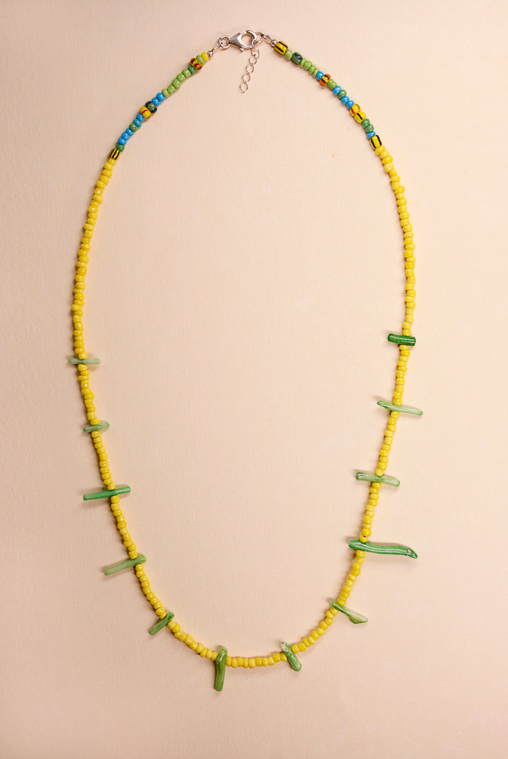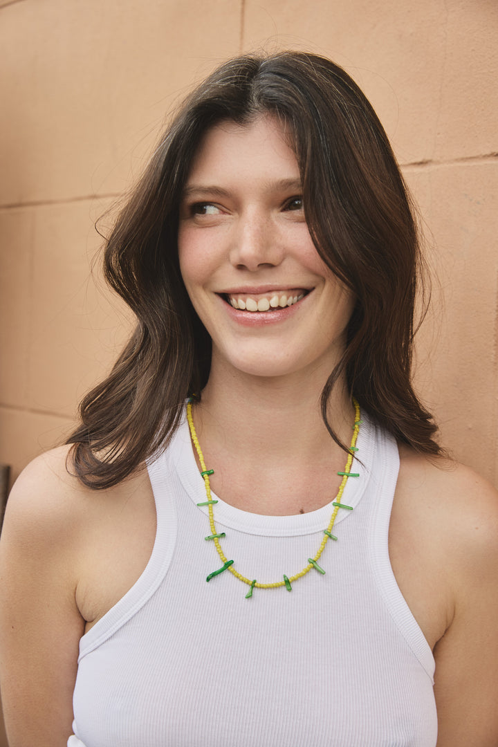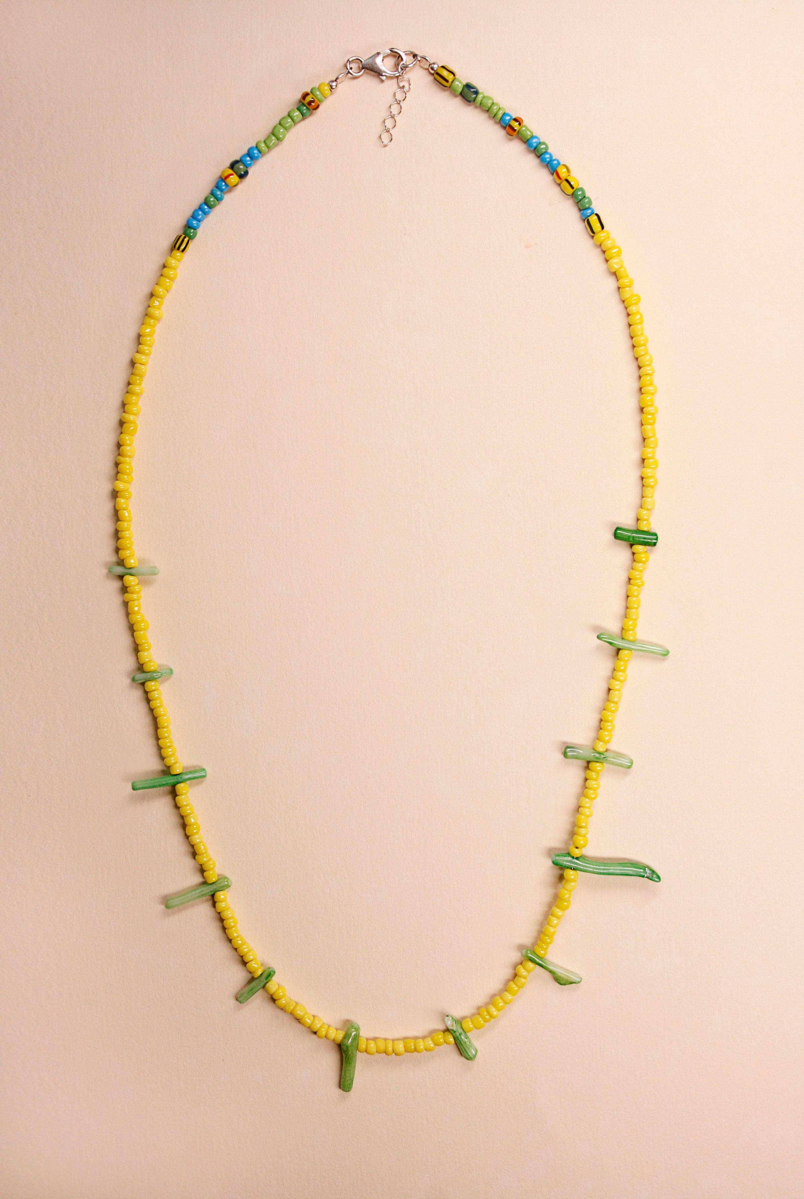 Citrus Gleam mirrors the vivid zest of a lemon grove at peak sunlight. This necklace, with its lively yellow and fresh green beads, embodies the essence of summer's vibrant energy, perfect for adding a splash of cheer to any ensemble.