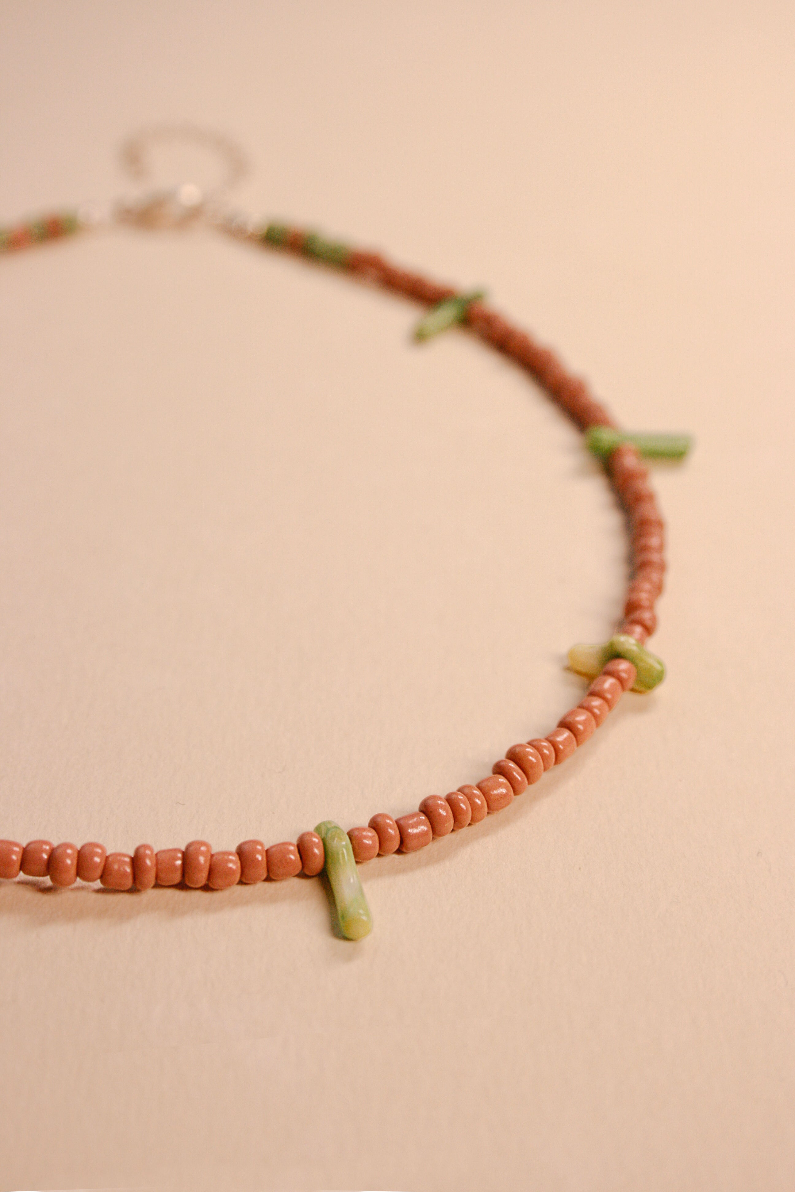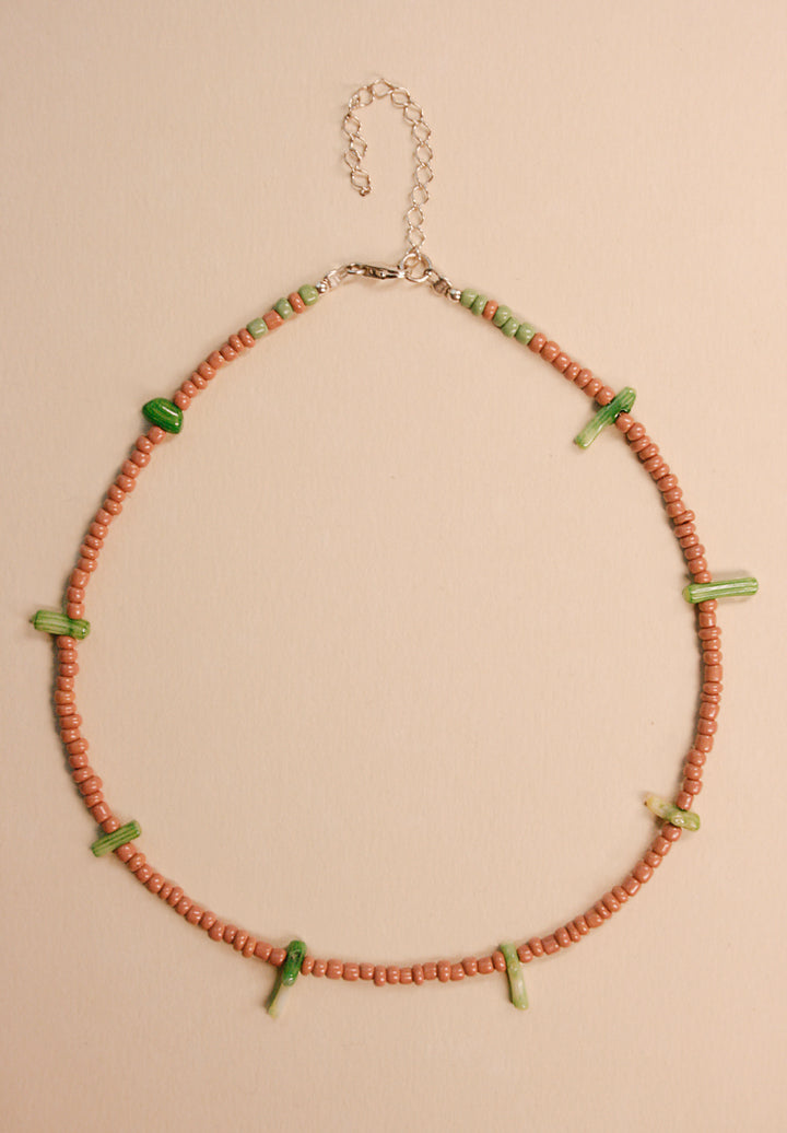 Grove Whisper captures the serene essence of a forest canopy. With earthy tones accented by fresh green beads, this necklace evokes the quiet calm of a woodland walk, perfect for adding a touch of nature’s tranquility to your ensemble.
