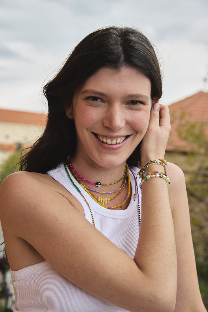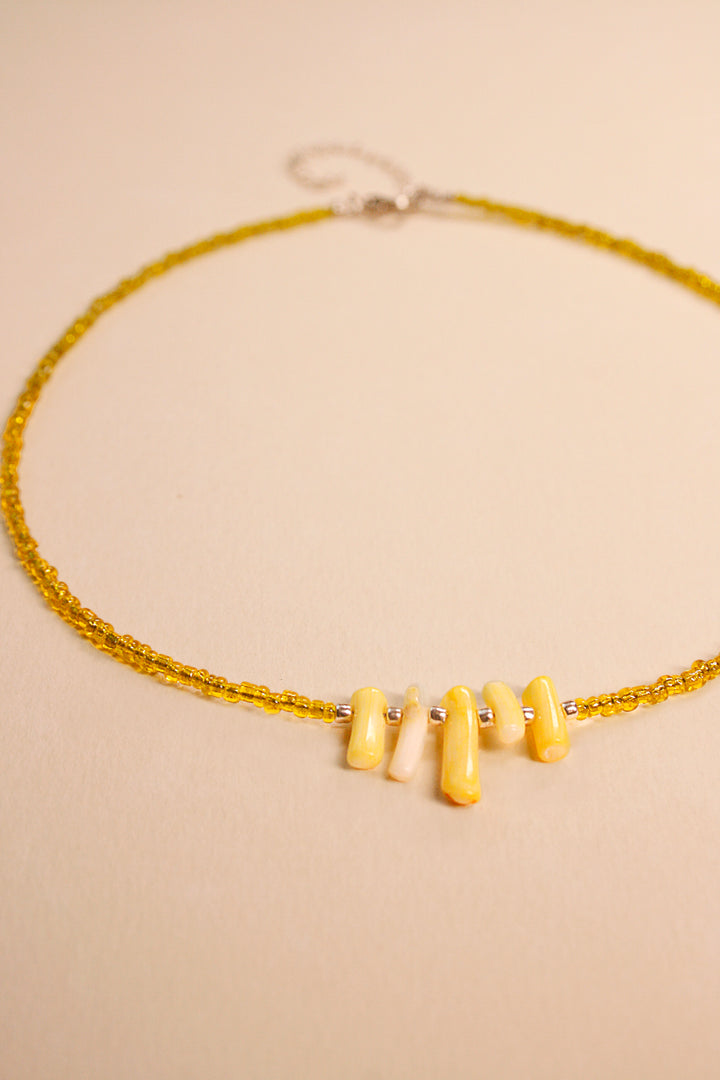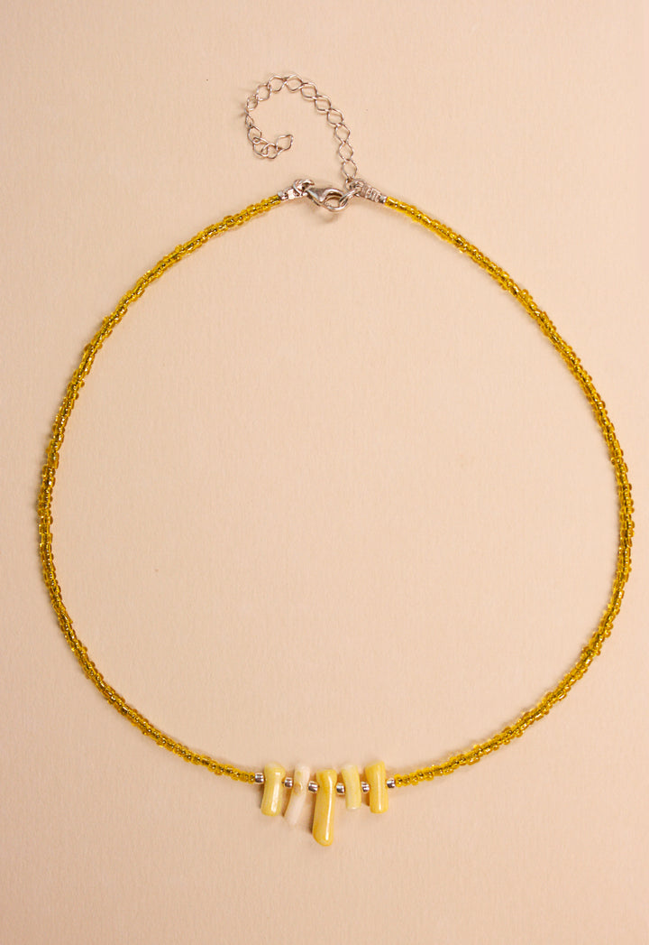 Lemon Zest brings a burst of summer freshness to your wardrobe. With its bright yellow tone and charming bead accents, this necklace embodies the invigorating spirit of sunny days and lemonade stands, perfect for adding a playful pop of color.