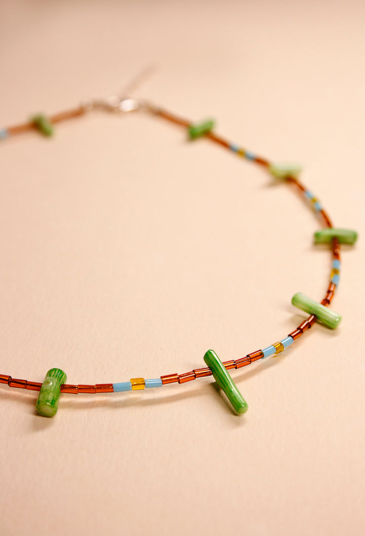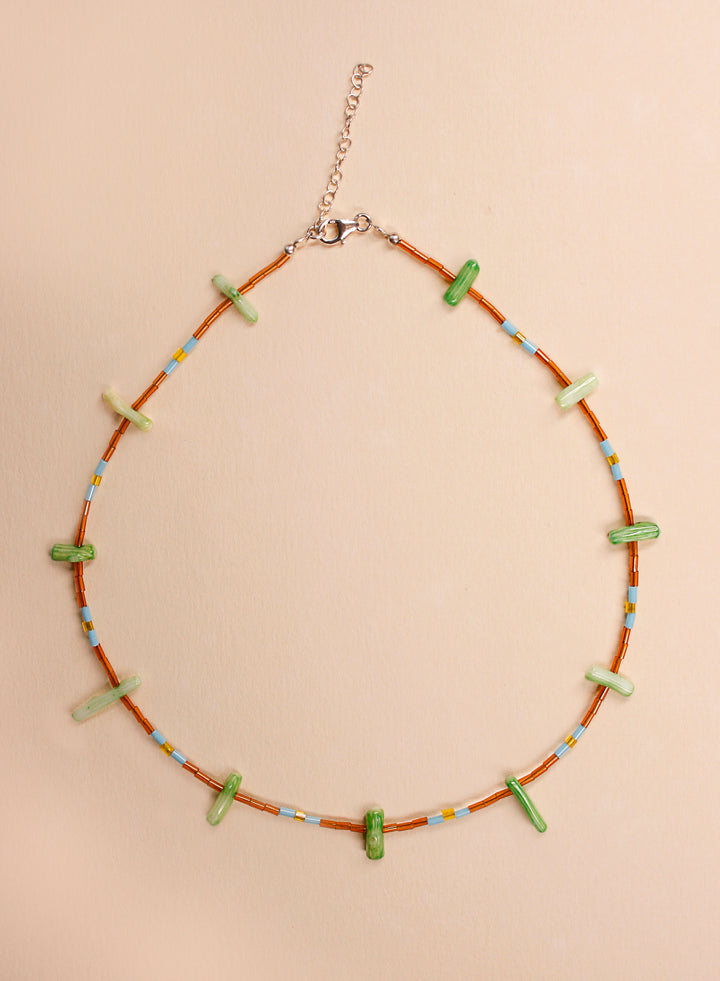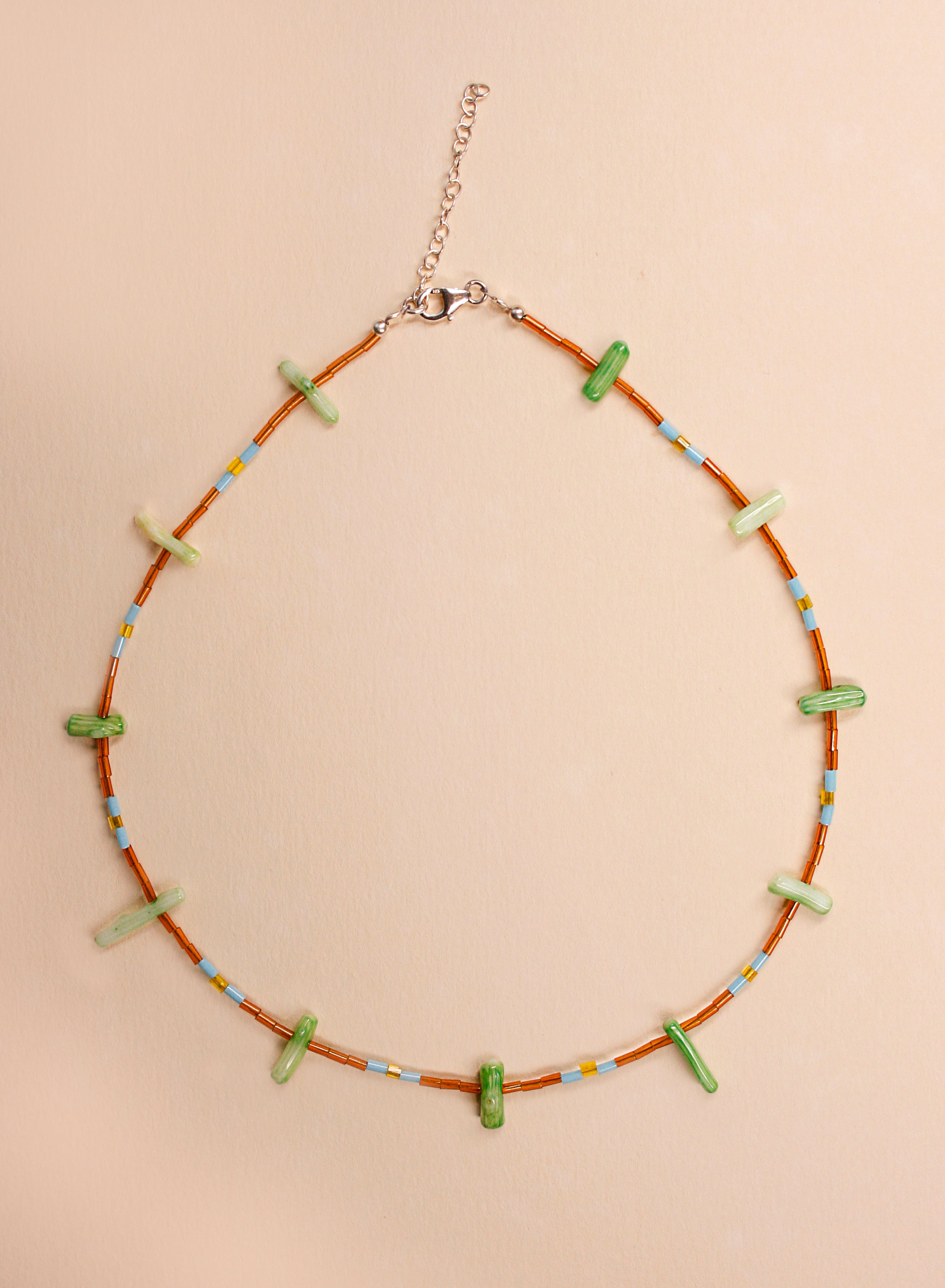 Meadow Dance captures the playful spirit of a day spent in sunlit fields. With its cheerful mix of green, yellow, and blue beads, this necklace brings the joy of spring meadows to your style, ideal for adding a burst of color and life to any outfit.